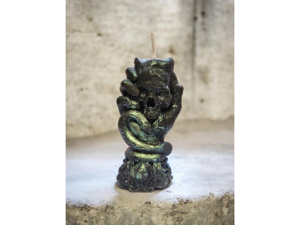Svíčka Dark Ritual – Mystic Edition je výjimečný kousek pro ty, kteří milují temnou estetiku, originální design a vůně s charakterem. Ručně odlité tělo z prémiového olivového vosku tvoří dramatická scéna: ruka svírající lebku, kolem níž se vine had, stojící na detailně zdobeném podstavci. Výrazný perleťovo-metalický efekt dodává svíčce mystický nádech – pod světlem se jemně leskne do zelených a modravých tónů, jako by byla oživena magií.
