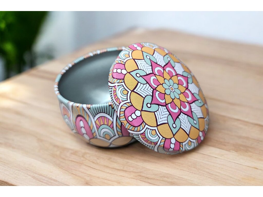 Dóza je vyrobena z pevného kovu, vnitřek je hladký a příjemný na dotek. Odnímatelné víčko dobře sedí a chrání obsah před prachem. Bohatý barevný vzor dodává dóze osobitý charakter a dělá z ní také krásný dárkový obal nebo samostatný dekorační prvek.