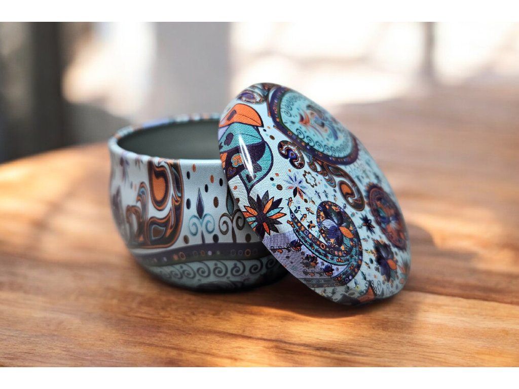 Stylová kulatá dózička s pevným víčkem je praktickým i estetickým doplňkem pro uložení drobných pokladů. Je vyrobena z kovu, uvnitř hladká v matném provedení, z vnější strany zdobená výrazným barevným motivem. Díky kompaktním rozměrům se snadno vejde do kabelky, šuplíku i cestovní tašky.