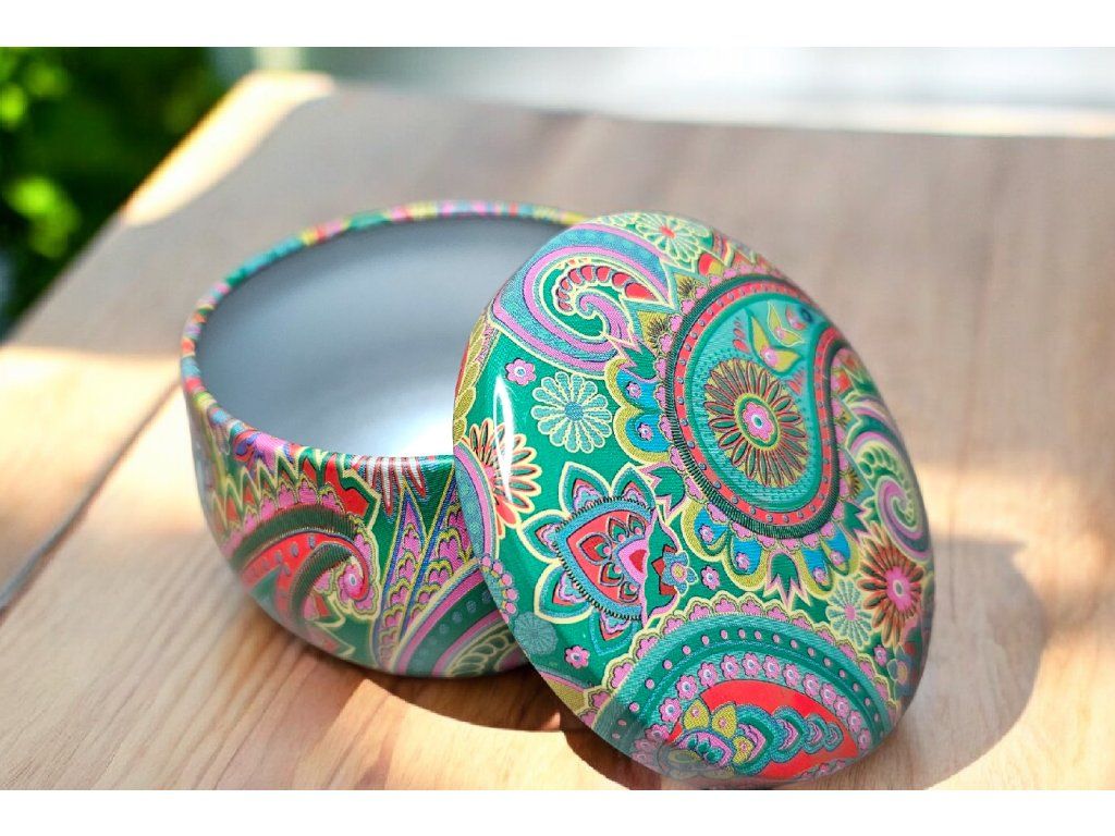 Krabička je vyrobena z lehkého kovu, vnitřek je hladký a snadno udržovatelný. Víčko dobře přiléhá a chrání obsah před prachem. Originální potisk dodává krabičce jedinečný vzhled a dělá z ní také krásný dekorační prvek.