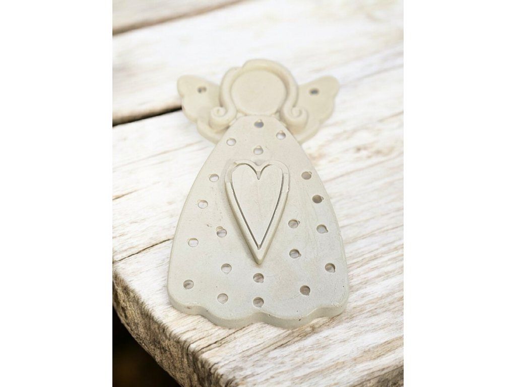 Srdíčko uprostřed andělských šatů krásně podtrhuje symboliku lásky, ochrany a pohody. Anděl je ručně odlitý, takže každý kus má malinké originální detaily, které z něj dělají unikát.