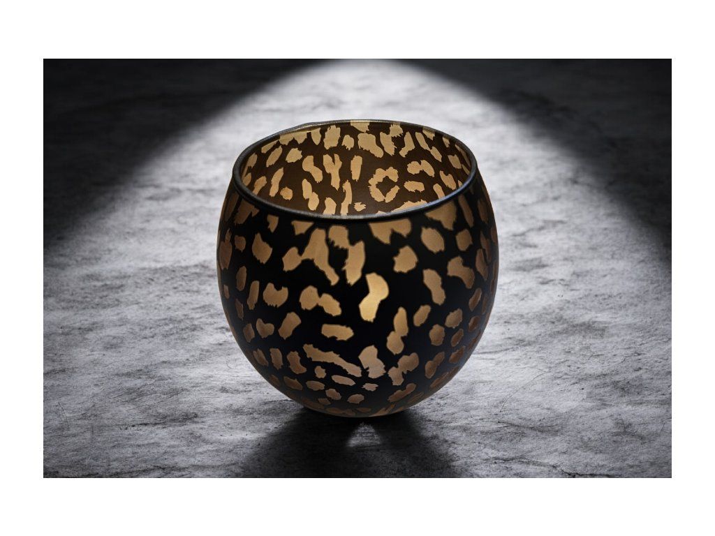 Tento elegantní kulatý svícínek z tmavého skla zaujme výrazným leopardím motivem, který po zapálení svíčky nádherně prosvítá teplým zlatavým světlem. Kontrast matného černého povrchu a lesklých zlatých skvrn vytváří luxusní atmosféru a dodá interiéru šmrnc exotiky.