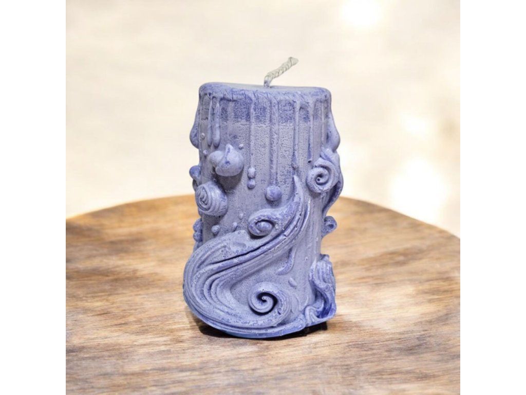 Originální fialová svíčka s výraznou plastickou strukturou připomínající vířící energii, kapky a tekoucí ornamenty. Její detailně propracovaný povrch dělá z obyčejné svíčky malý umělecký kousek, který na první pohled zaujme a skvěle doplní atmosféru interiéru.