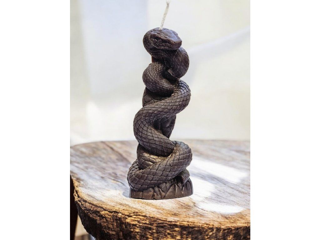 Tato elegantní a zároveň dramatická svíčka z olivového vosku má podobu realisticky zpracovaného hada, který se spirálovitě ovíjí kolem vlastního těla. Dokonale vystižené šupiny, dynamický tvar a celkový design z ní dělají výjimečný dekorační kousek pro milovníky originality, mystiky a temnější estetiky.