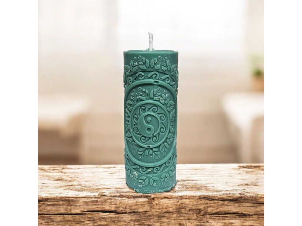 Ručně odlévaná svíčka ze 100% sojového vosku v elegantním zeleném odstínu. Dominantním prvkem je nádherný reliéf Yin-Yang obklopený jemnými listy a ornamenty, které dodávají svíčce harmonický a přírodní vzhled. Ideální jako dekorace i jako originální dárek.