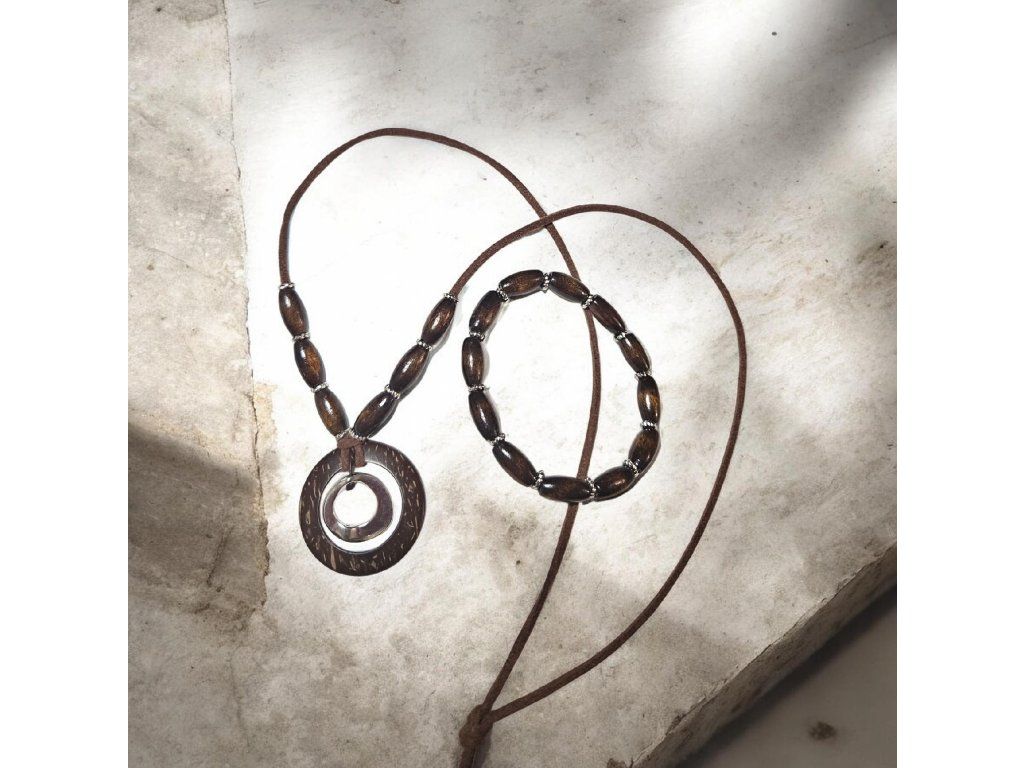 Elegantní šperkový set inspirovaný přírodními tóny a jednoduchou krásou přírodních materiálů. Náhrdelník zdobí výrazný kruhový přívěsek v zemitých odstínech, který symbolizuje harmonii a nekonečný tok energie. Doplňují ho podlouhlé dřevěné korálky v tmavém tónu, jež spolu s ladícím náramkem vytvářejí dokonale sladěný celek.