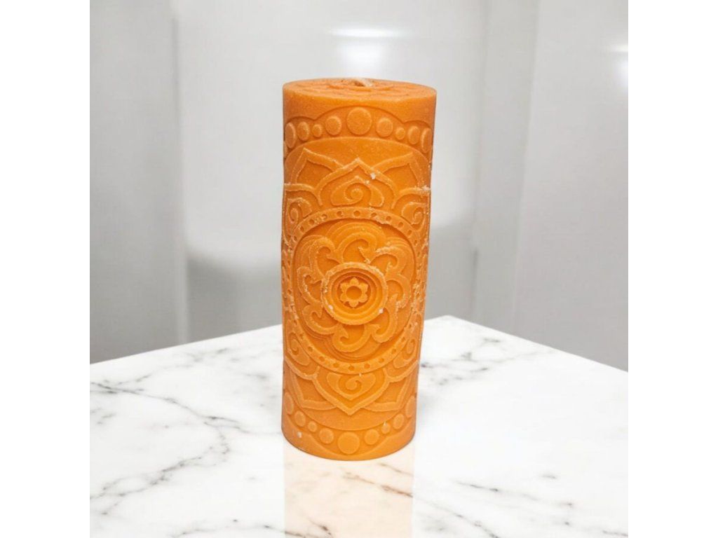Tahle oranžová mandalová kráska je přesně ten typ svíčky, která udělá dojem ještě dřív, než ji vůbec zapálíš. Jemně matná textura, čisté linie a precizně vyrytý mandalový motiv vytvářejí harmonický kousek, který se hodí do moderního i přírodního interiéru.