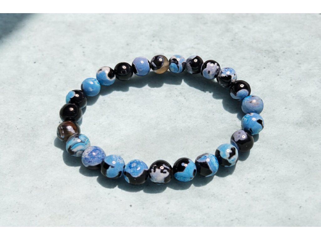 Minerální náramek v kombinaci modrého a černého achátu symbolizuje klid, stabilitu a vnitřní sílu. Modré tóny připomínají ticho vody a otevřený prostor mysli, zatímco tmavé korálky dodávají uzemnění a ochranu.