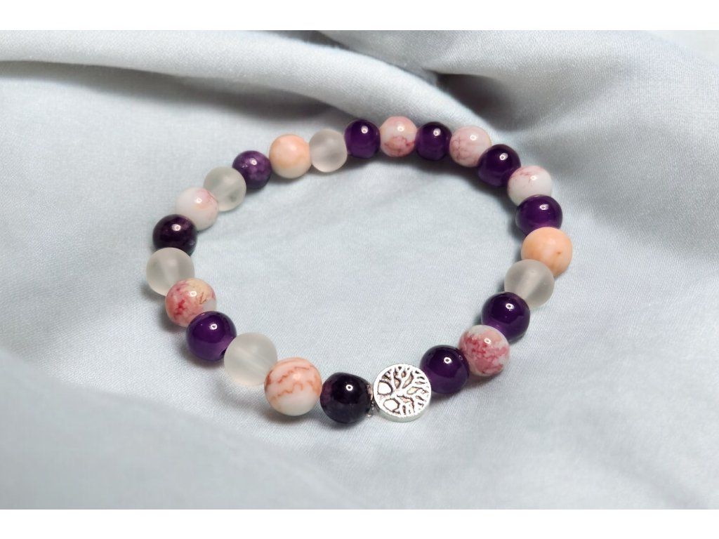 Ametyst zklidňuje mysl a posiluje intuici, růženín otevírá srdce a přináší laskavost, zatímco křišťál harmonizuje a zesiluje energii celku. Přívěsek stromu života připomíná vnitřní sílu, růst a propojení se sebou samým.