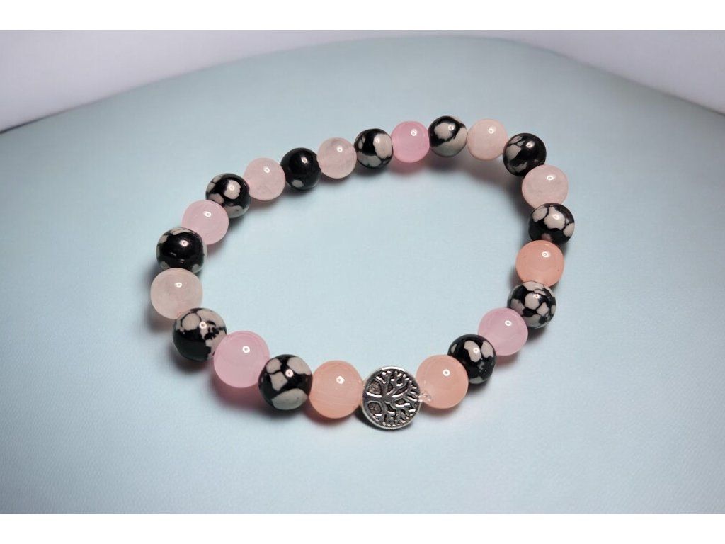 Minerální náramek v kombinaci růženínu a sněžného obsidiánu propojuje jemnost s ochranou. Růženín přináší lásku, klid a otevřené srdce, zatímco obsidián dodává pocit bezpečí, stability a uzemnění.