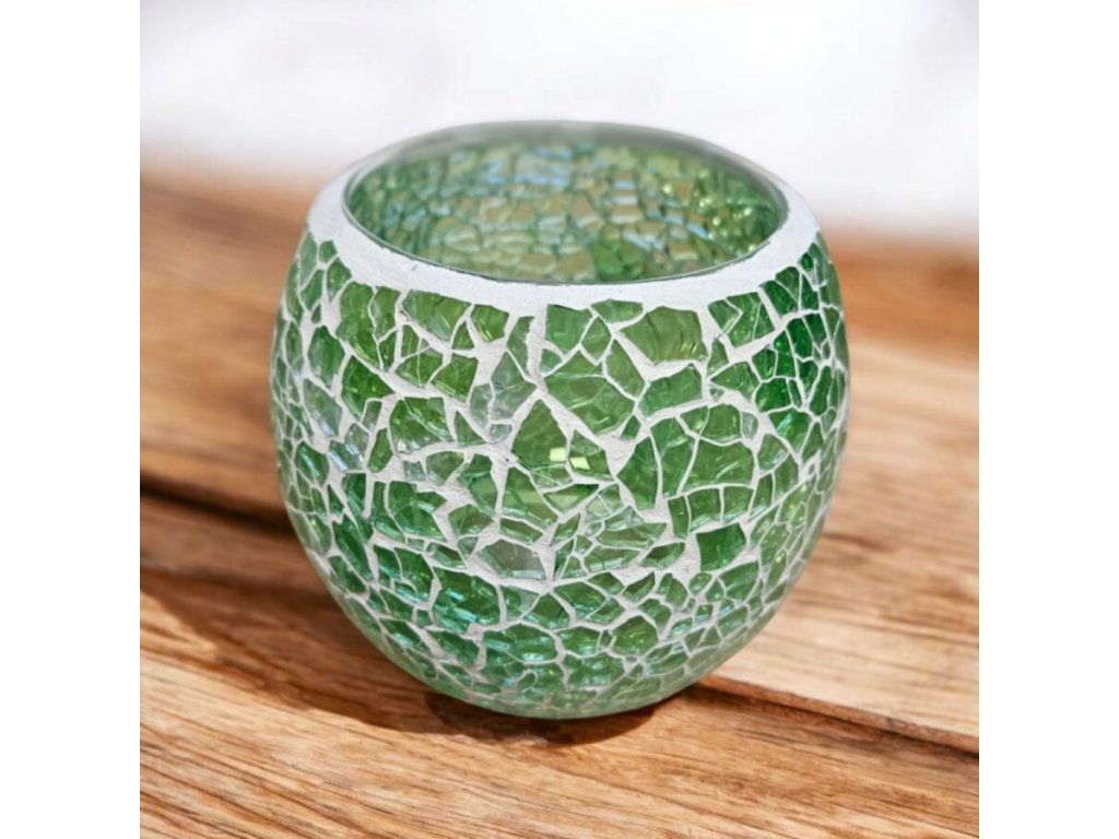 Tenhle mozaikový svícen v tónech svěží zeleně působí jako kousek přírody zachycený ve skle. Ručně skládané střípky tvoří jemnou mozaiku, která při zapálení svíčky rozzáří celý svícen teplým, uklidňujícím světlem.