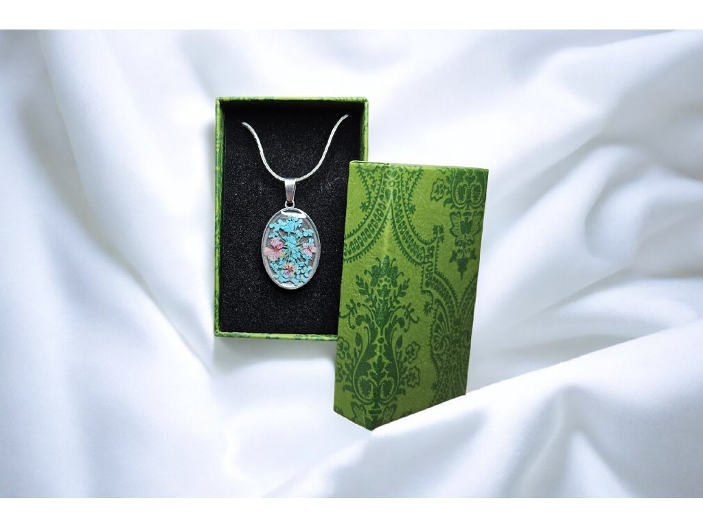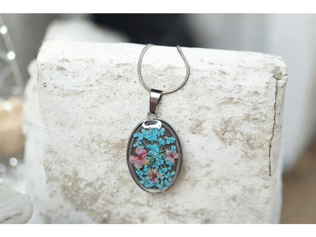 Ručně vyráběný náhrdelník s pravými sušenými květy zalitými v pryskyřici je jemným šperkem, který v sobě nese klid, lehkost a krásu přírody. Oválný přívěsek ukrývá drobné květy v harmonickém ladění barev, které působí něžně a zároveň originálně.