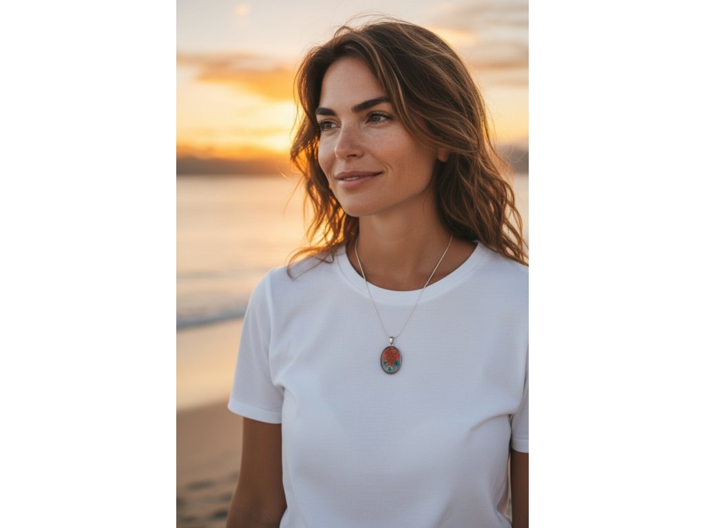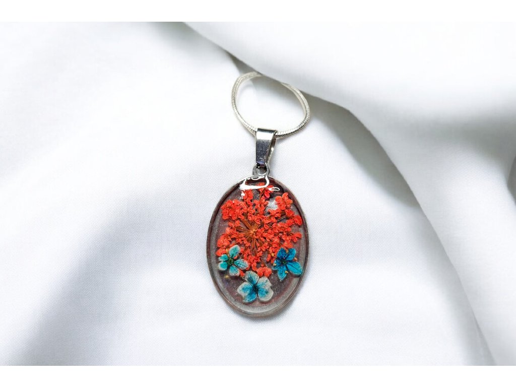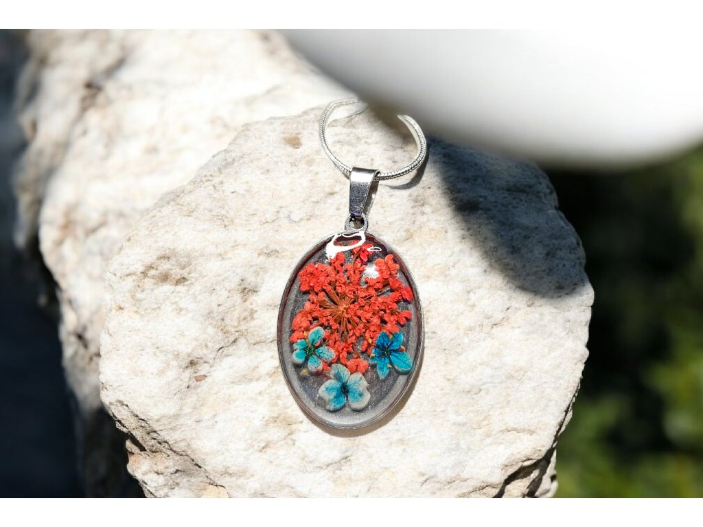 Ručně vyráběný náhrdelník s pravými sušenými květy zalitými v pryskyřici zachycuje radost, barvy a křehkost přírody v jednom jemném šperku. Kombinace červených a modrých květů vytváří harmonický kontrast, který přitahuje pohled a dodává náhrdelníku osobitý charakter.