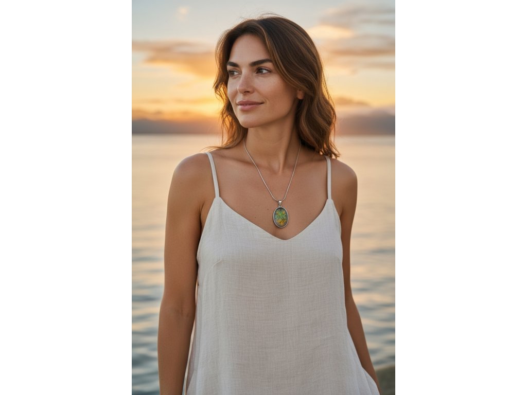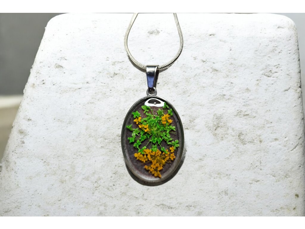 Ručně vyráběný náhrdelník s pravými sušenými květy zachycuje drobný kousek rozkvetlé louky v jejím přirozeném rytmu. Oválný přívěsek ukrývá jemné zelené a žluté kvítky, které společně vytvářejí svěží, harmonickou kompozici plnou života a lehkosti.
