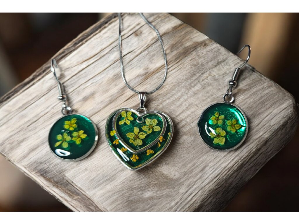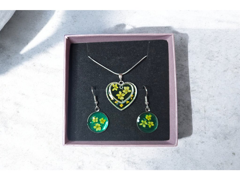 Jemná a originální sada šperků s motivem skutečných květin zalitých v čiré pryskyřici. Zelený podklad krásně zvýrazňuje drobné žluté květy a dodává šperkům svěží, přírodní vzhled. Každý kus je jedinečný díky přirozenému rozmístění květů.