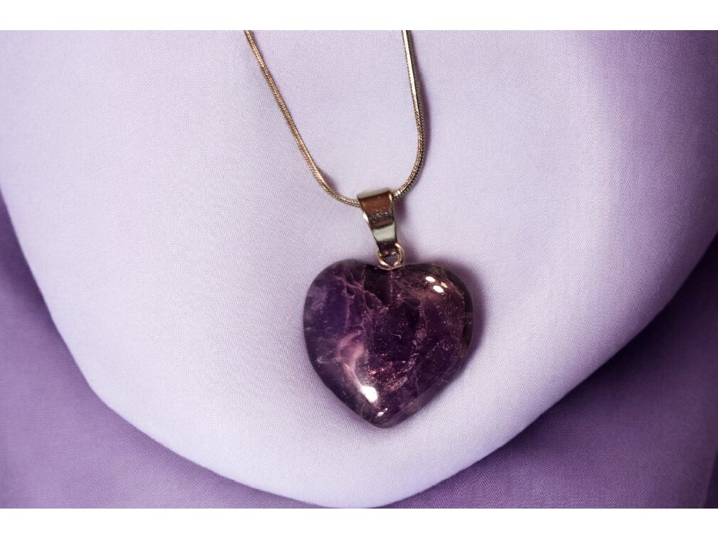 Elegantní náhrdelník s leštěným přívěškem ve tvaru srdce z přírodního ametystu okouzlí svou hlubokou fialovou barvou a jedinečnou kresbou kamene. Každý kus je originál vytvořený přírodou – jemné přechody odstínů a struktura kamene dělají z každého náhrdelníku neopakovatelný šperk.