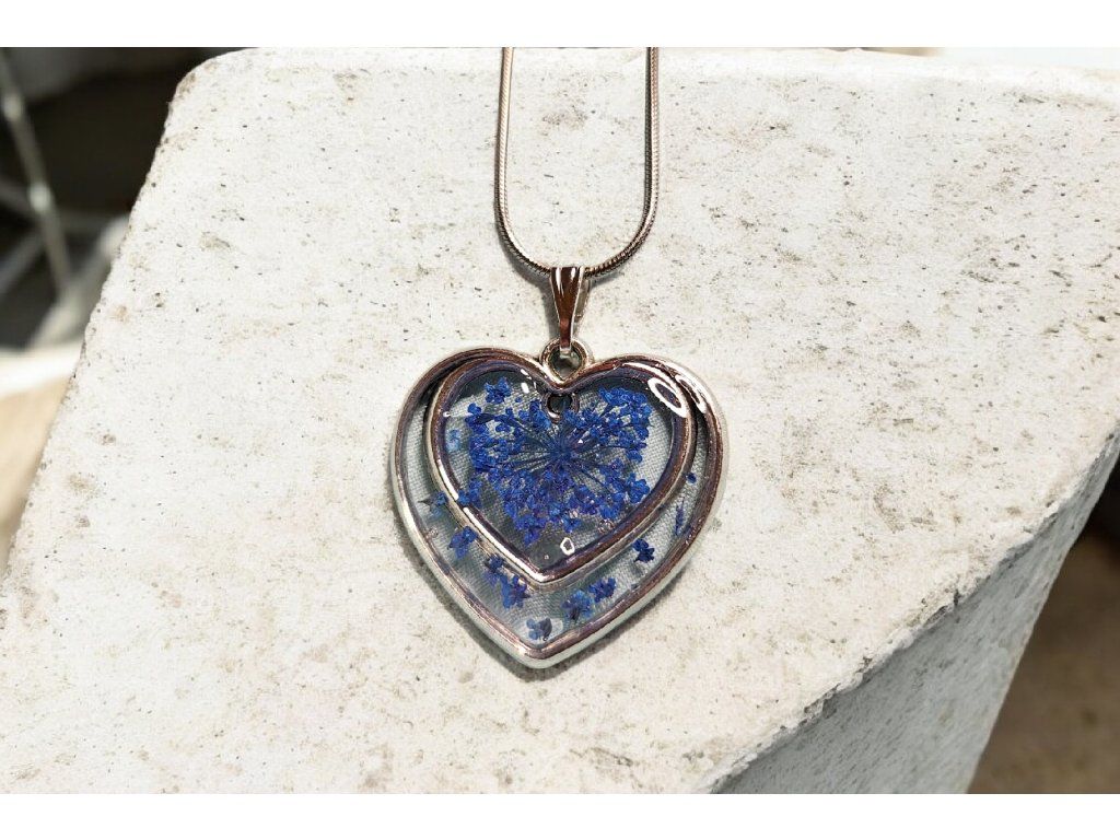 Náhrdelník v modrých tónech působí klidně, jemně a harmonicky. Uvnitř srdce jsou ručně zasazeny skutečné sušené květy v odstínech modré, které jsou zalité v čiré pryskyřici. Díky průhlednosti vyniká přirozená struktura květů i jejich jemná kresba, která připomíná tichý rozkvět uprostřed klidu.