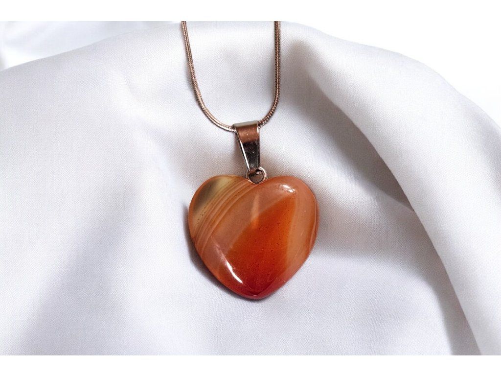 Náhrdelník s přívěskem ve tvaru srdce z přírodního kamene v teplých oranžovo‑červených tónech zaujme na první pohled svou hloubkou barev a přirozenou kresbou. Každý kus je originál – jemné pruhování a barevné přechody jsou výsledkem jedinečné struktury kamene.