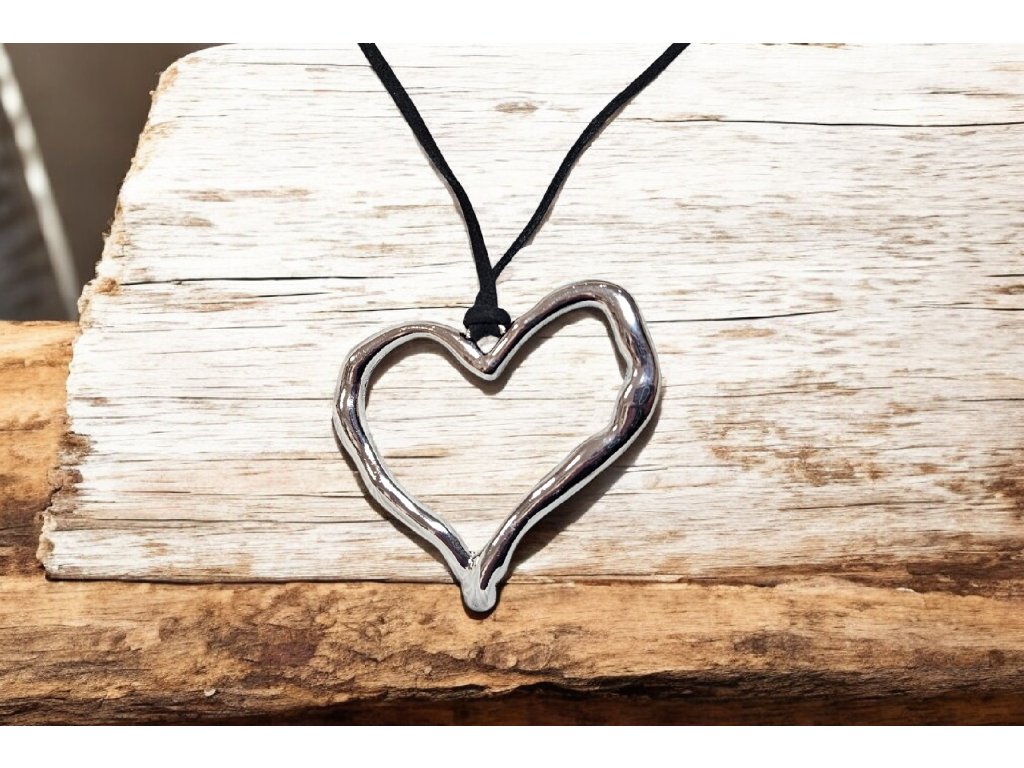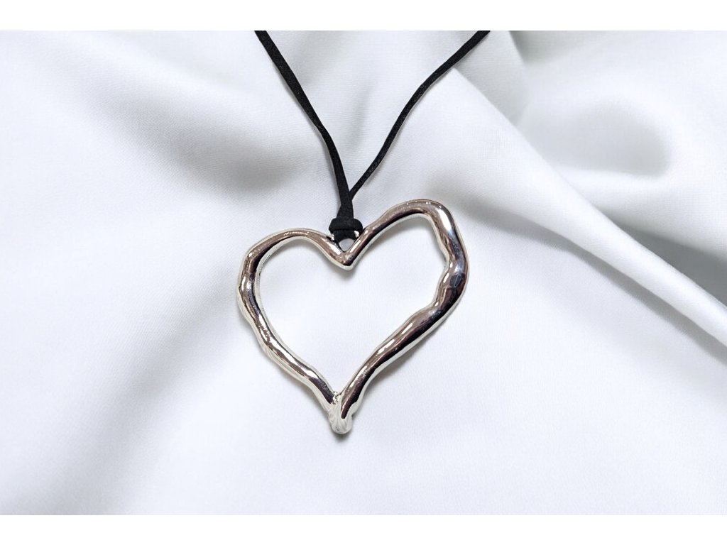 Elegantní náhrdelník s otevřeným přívěskem ve tvaru srdce zaujme svou jednoduchostí a jemně nepravidelnou linií, která mu dodává moderní, ručně působící charakter. Lesklý kov ve stříbrném tónu krásně kontrastuje s černou šňůrkou, díky čemuž se šperk snadno kombinuje s každodenním i slavnostnějším outfitem.