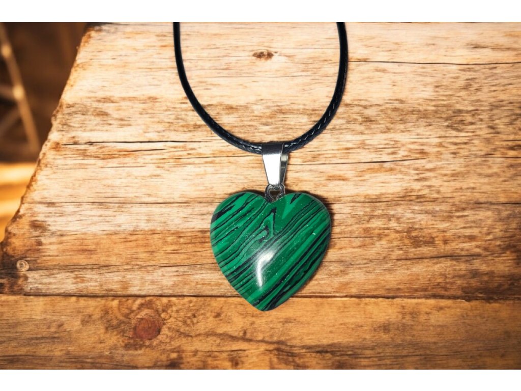 Elegantní náhrdelník s leštěným kamenným přívěskem ve tvaru srdce z přírodního malachitu, který zaujme svou typickou zelenou kresbou. Každý kámen je originál, takže se může jemně lišit strukturou a odstínem. Minimalistický design je doplněn černou šňůrkou a kovovými komponenty z kvalitní nerezové oceli.