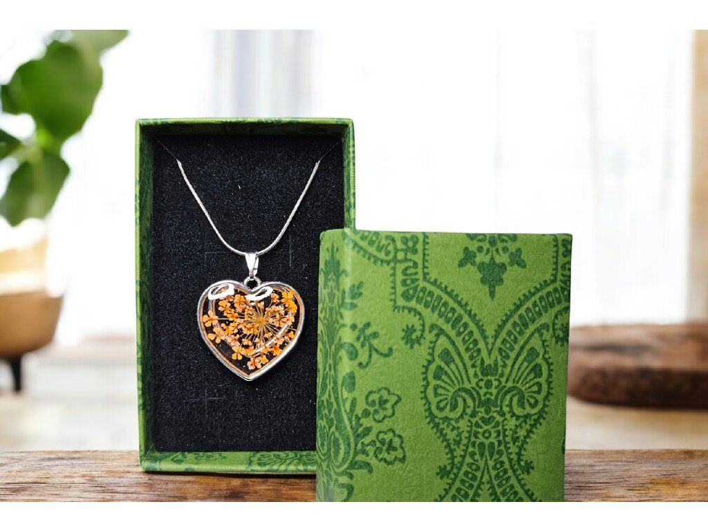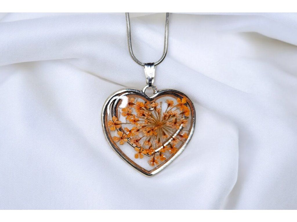 Náhrdelník Srdce v rozkvětu v teplých oranžových tónech symbolizuje radost, energii a vnitřní světlo. Uvnitř jemného srdce jsou ručně zasazeny skutečné sušené květy, jejichž přirozená struktura a barva zůstává zachována díky zalití v čiré pryskyřici. Každý detail působí lehce a vzdušně, jako by květy právě rozkvétaly.