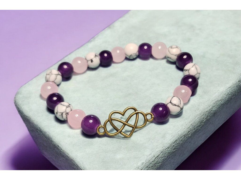 Růženín je kamenem bezpodmínečné lásky a něhy, pomáhá hojit emocionální zranění a posiluje vztah k sobě i druhým. Ametyst přináší klid, ochranu a duchovní rovnováhu, zatímco howlit podporuje trpělivost, harmonii a uvolnění napětí.