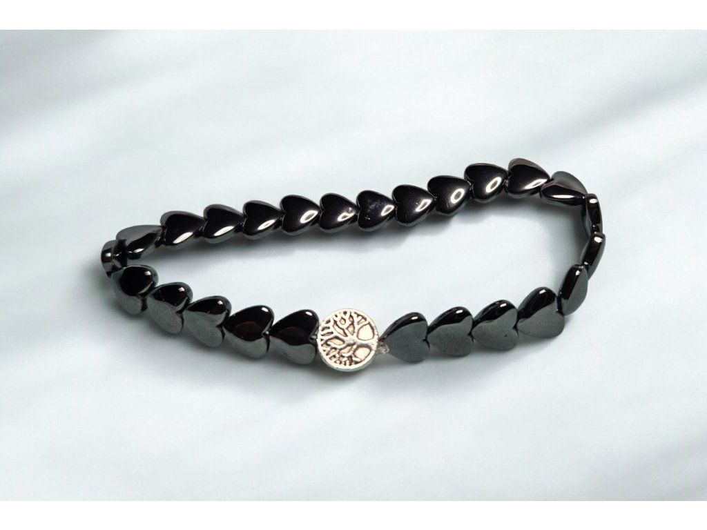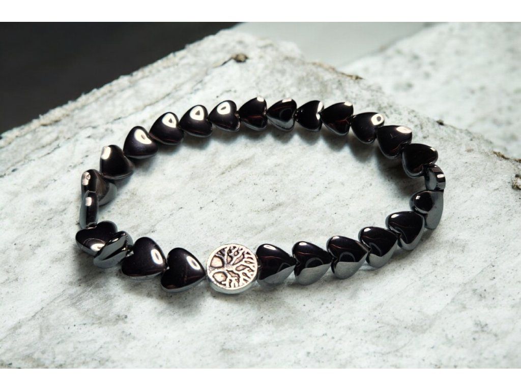 Elegantní náramek tvořený leštěnými srdíčky z hematitu v tmavě kovovém odstínu je nejen stylovým doplňkem, ale i silným energetickým talismanem. Dominantou náramku je středový kovový prvek se symbolem Stromu života, který představuje propojení těla, mysli a duše, růst, stabilitu a harmonii.