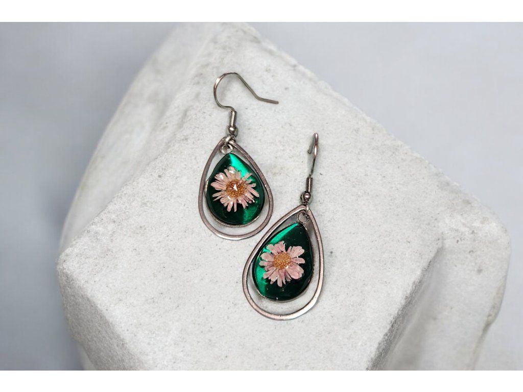 Jemné ručně vyráběné náušnice s pravým sušeným květem zachycují krásu přírody v její nejčistší podobě. Růžový květ zalitý v zelené pryskyřici působí něžně, lehce a přirozeně – jako malý kousek rozkvetlé louky uchovaný v čase.