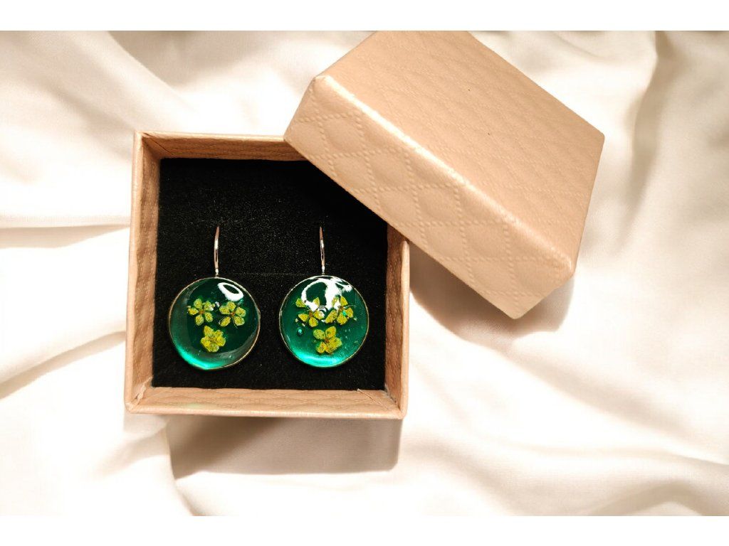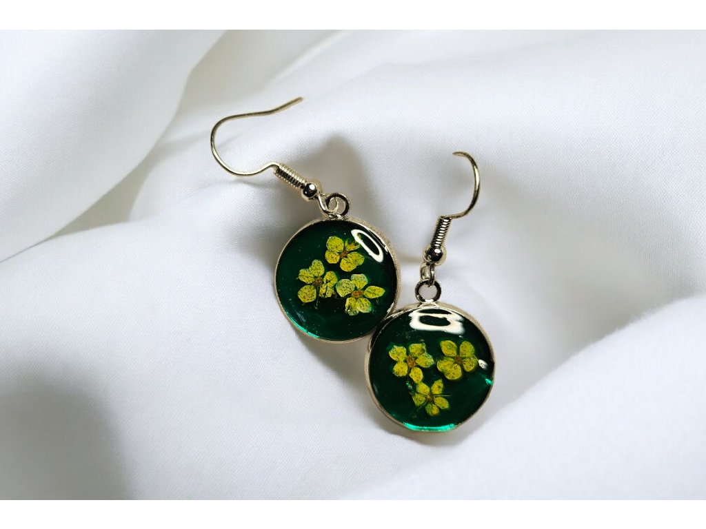 Ručně vyráběné náušnice s pravými sušenými květy zalitými v pryskyřici v sobě nesou klid a krásu přírody. Drobné žluté květy v tmavě zeleném podkladu připomínají lesní louku zalitou měkkým světlem.