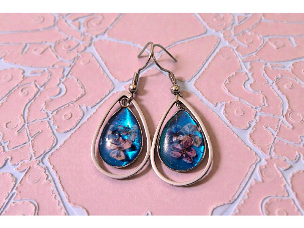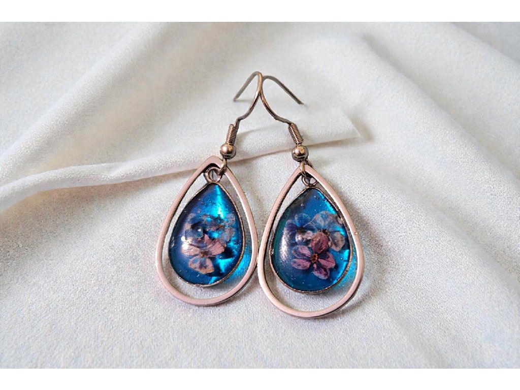 Tyto okouzlující náušnice ve tvaru kapky zachycují jemnou květinu v průzračné modré pryskyřici, která se na světle třpytí jako voda pod večerním nebem. Elegantní kovový rám dodává šperku lehkost a sofistikovaný vzhled. Ideální pro ženy, které milují romantické detaily, jemnou estetiku a šperky, jež vyprávějí příběh.