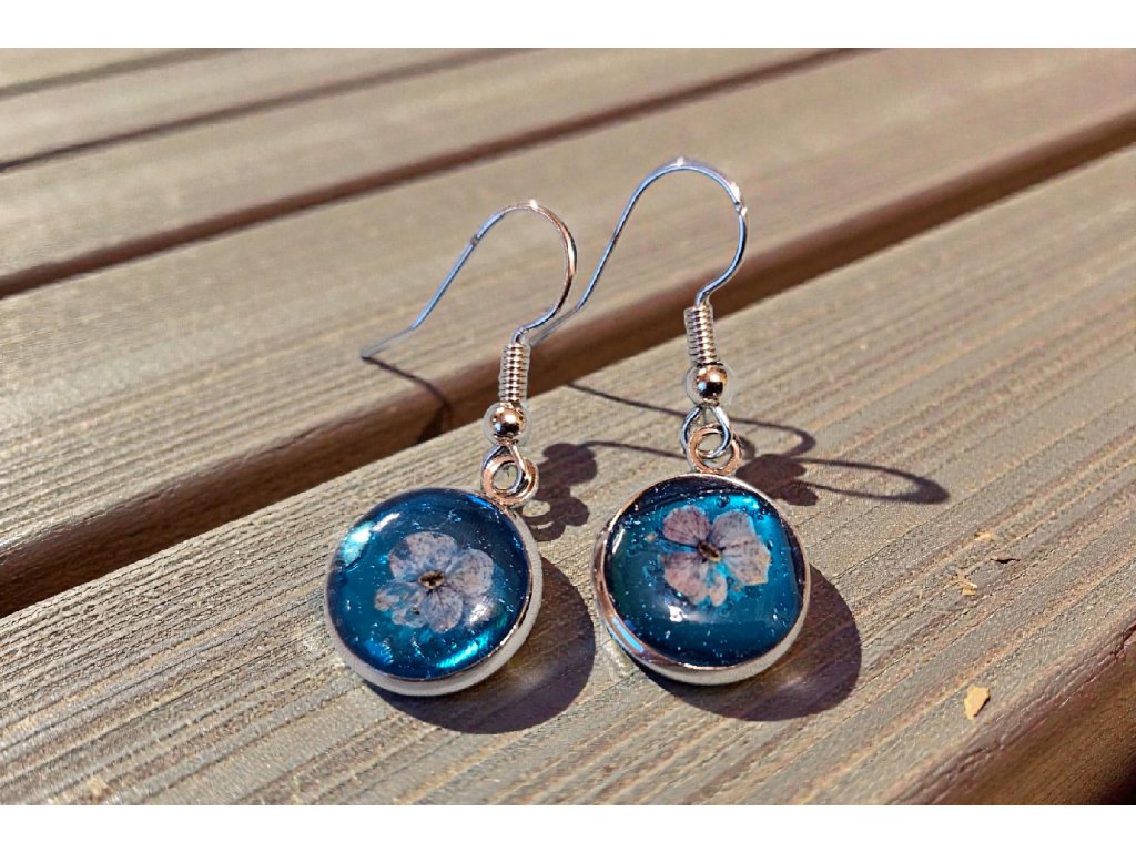 Tyto náušnice jsou jako maličký kousek léta zachycený ve šperku. Průzračný modrý podklad s detailní bílou květinou uvnitř vytváří efekt drobné kapičky rosy, která se blyští na slunci. Elegantní kovové rámečky a lehké provedení dělají z náušnic jemný doplněk pro každý den.