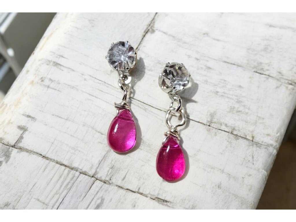 Jemné a ženské visací náušnice, které zaujmou svou čistotou, lehkostí a výrazným barevným akcentem. Kombinace třpytivé skleněné puzety a sytě růžové skleněné slzy vytváří elegantní šperk, jenž dodá outfitu jemný, ale nepřehlédnutelný detail.