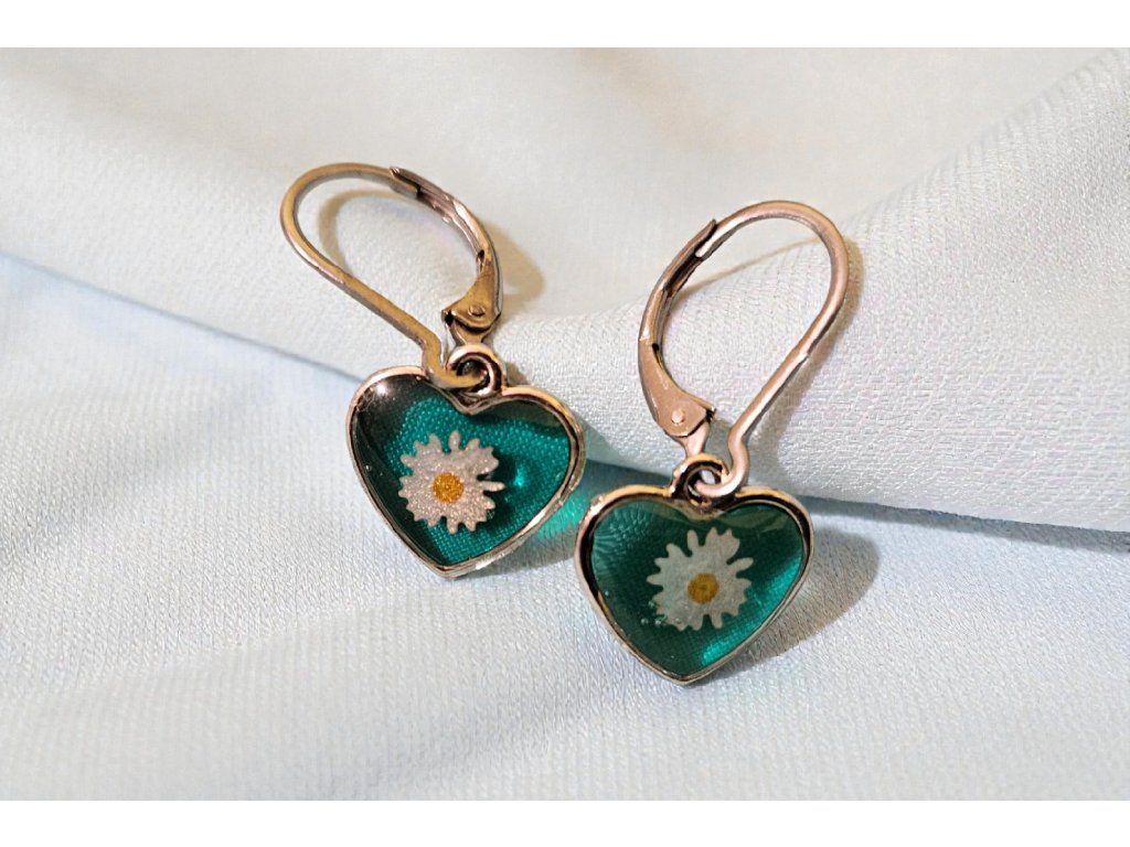 Něžné, hravé a s dotekem jarní svěžesti. Tyto náušnice ve tvaru srdce spojují tyrkysově zelený podklad s detailní bílou kopretinou uprostřed, čímž vytvářejí dokonale ženský a optimistický šperk. Odlehčený design vynikne při každodenním nošení, ale neztratí se ani při slavnostních příležitostech.