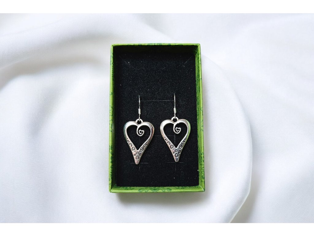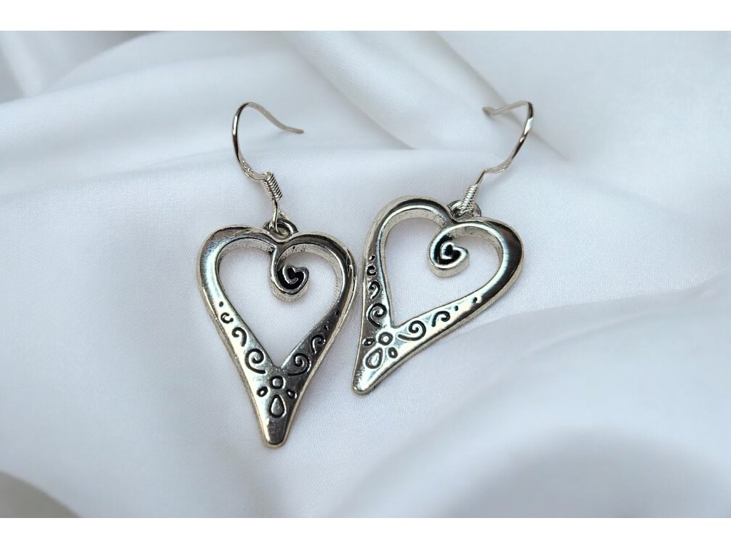 Romantické visací náušnice ve tvaru otevřeného srdce s jemnými ornamentálními detaily. Elegantní spirálky a lehce patinovaný stříbrný vzhled dodávají šperku vintage nádech a nadčasovou krásu. Díky vzdušnému designu působí náušnice lehce a jemně, přesto jsou výrazným doplňkem.