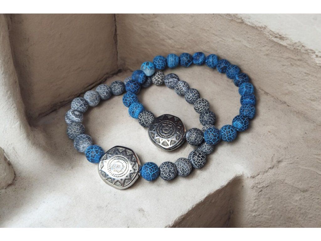 Stylové partnerské náramky z popraskaného achátu symbolizují spojení, rovnováhu a vzájemnou oporu. Kombinace modrého a šedého (černého) achátu vytváří harmonický kontrast, který se hodí jak pro ženy, tak pro muže. Každý korálek má díky charakteristické popraskané kresbě jedinečný vzhled, takže žádné dva náramky nejsou úplně stejné.