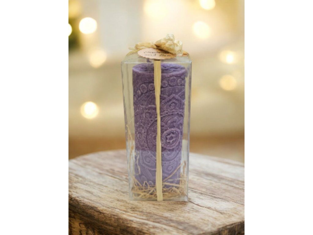 Ručně odlévaná mandalová svíčka – fialová (sojový vosk) v dárkovém balení
