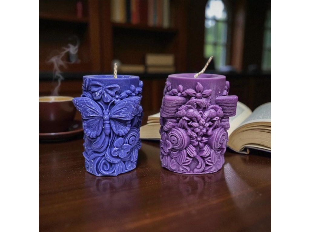 Tato elegantní modrá svíčka ze 100% sojového vosku je malým uměleckým dílem, které okamžitě zaujme svým bohatým reliéfem. Dominantou je nádherný plastický motýl rozprostírající křídla přes celou přední stranu – symbol lehkosti, svobody a proměny. Okolo něj se vine detailní ornamentální a květinová výzdoba, která dodává svíčce jemně romantický, ale zároveň výrazný charakter.