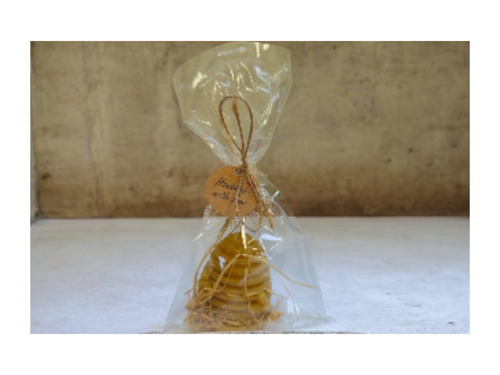 Kouzelná svíčka ve tvaru včelího úlu, tentokrát zabalená v jemném celofánu s přírodním provázkem a visačkou Handmade with love. Jednoduché, čisté, rustikální – přesně ten typ dárku, který působí mile, osobně a srdečně.