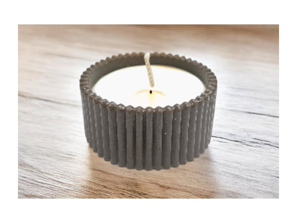 Nádoba má výraznou žebrovanou strukturu po celém obvodu, což jí dodává moderní vzhled a zároveň jemný rustikální nádech. Uvnitř se nachází přírodní světlá svíčka s bavlněným knotem, která po zapálení vytvoří útulné a klidné světlo.