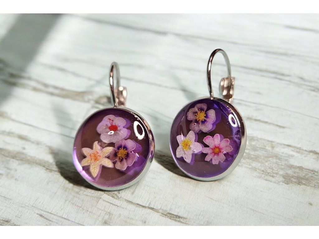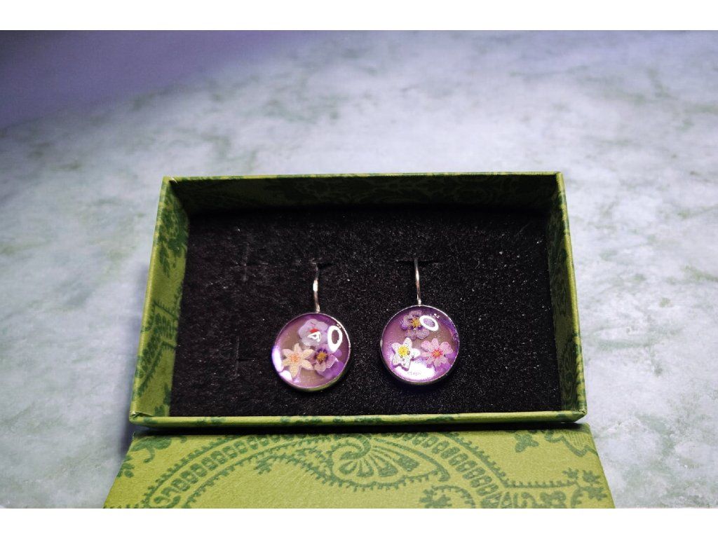 Jemné ručně vyráběné náušnice z křišťálové pryskyřice v elegantním fialovém odstínu. Uvnitř jsou zalité drobné květinové motivy v pastelových tónech, které vytvářejí romantický a hravý design s nádechem přírody. Lesklý povrch pryskyřice krásně zvýrazňuje barvy kvítků a podtrhuje precizní ruční zpracování.