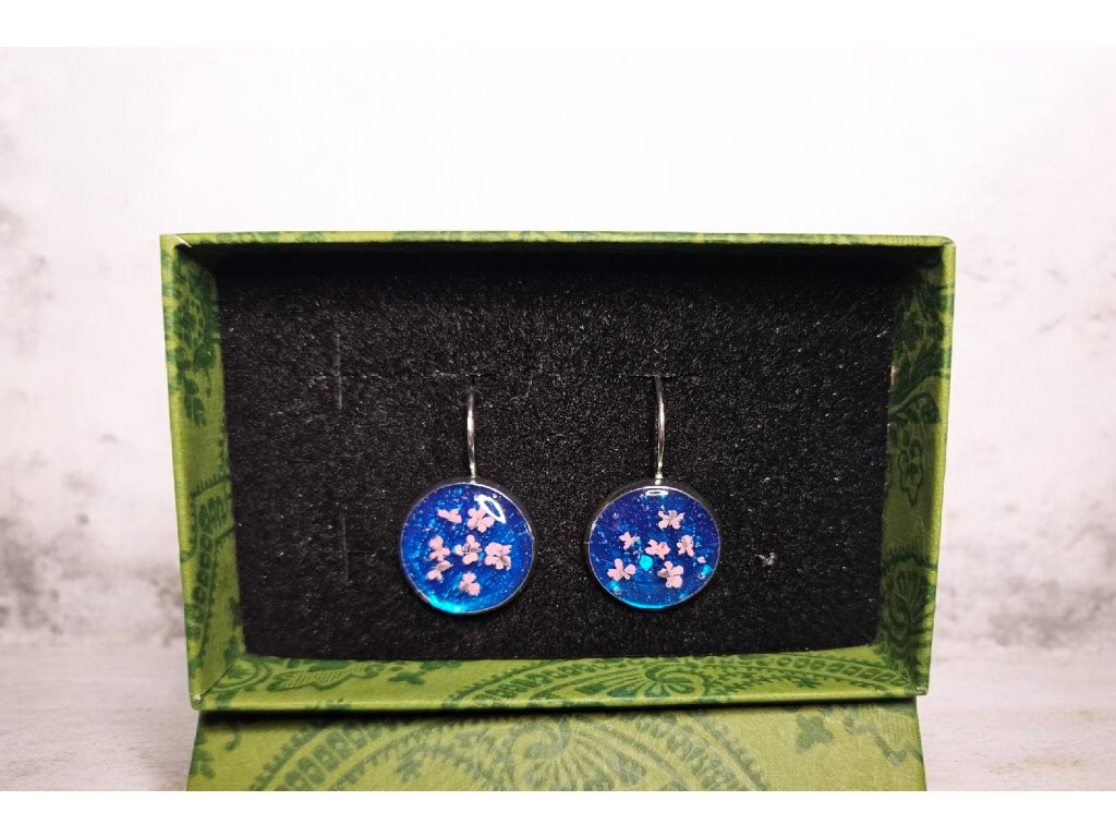 Elegantní ručně vyráběné náušnice z křišťálové pryskyřice v hlubokém modrém odstínu, který připomíná noční oblohu nebo klidnou hladinu moře. Uvnitř jsou zalité drobné růžové kvítky, které vytvářejí jemný kontrast a dodávají šperku romantický a originální vzhled.