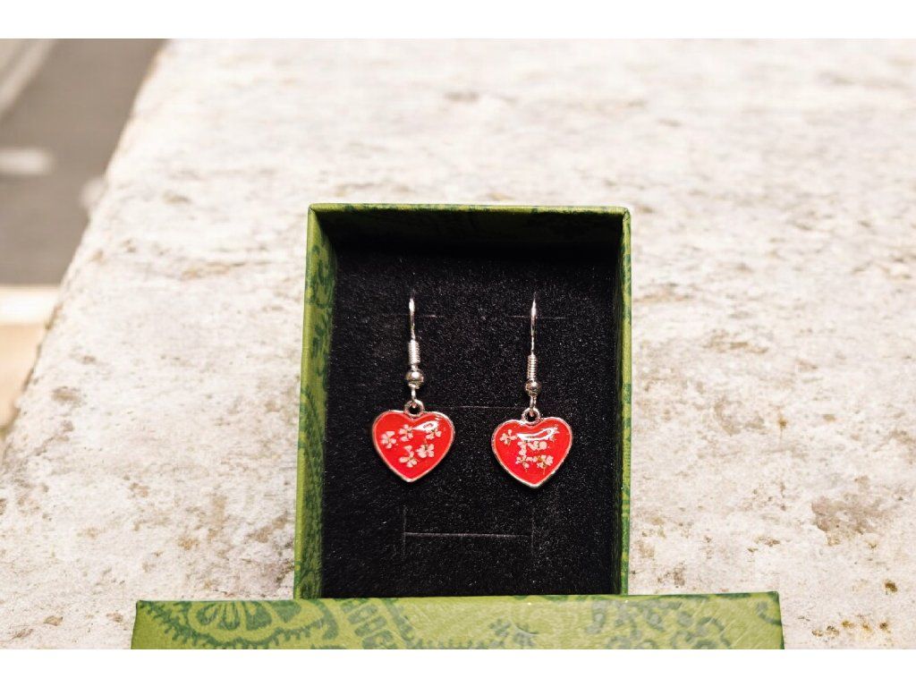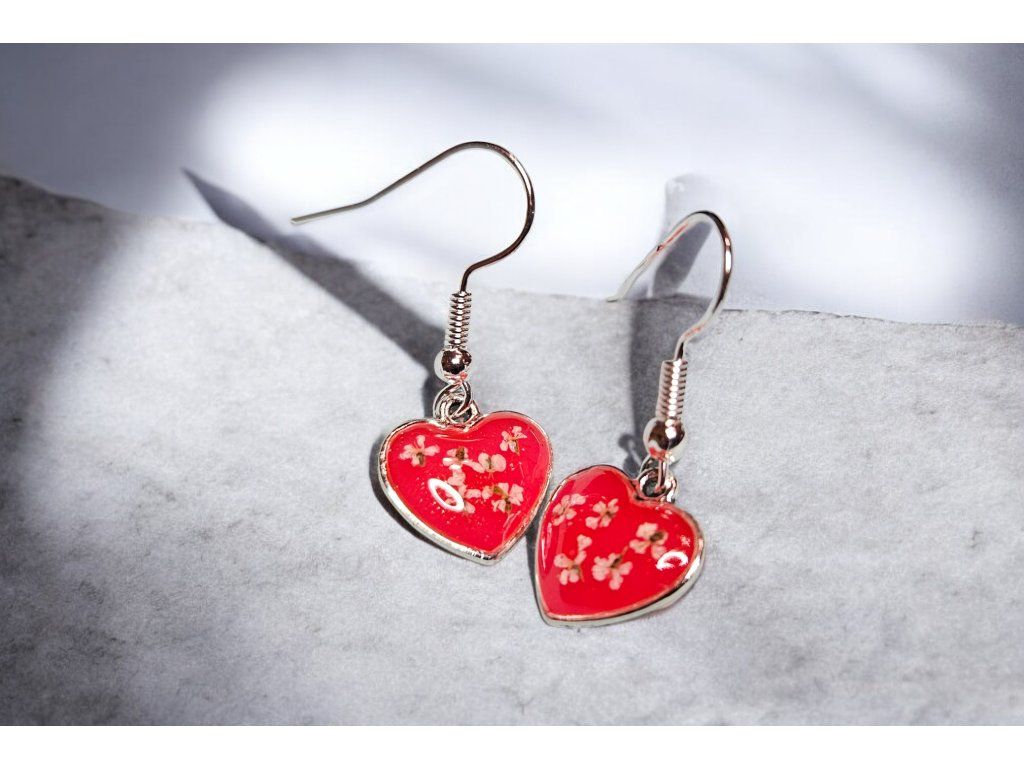 Romantické ručně vyráběné náušnice ve tvaru srdce z křišťálové pryskyřice. Uvnitř každého srdíčka jsou zalité jemné světlé kvítky, které vytvářejí něžný a originální vzhled. Lesklý povrch krásně odráží světlo a zvýrazňuje sytě červenou barvu pryskyřice.