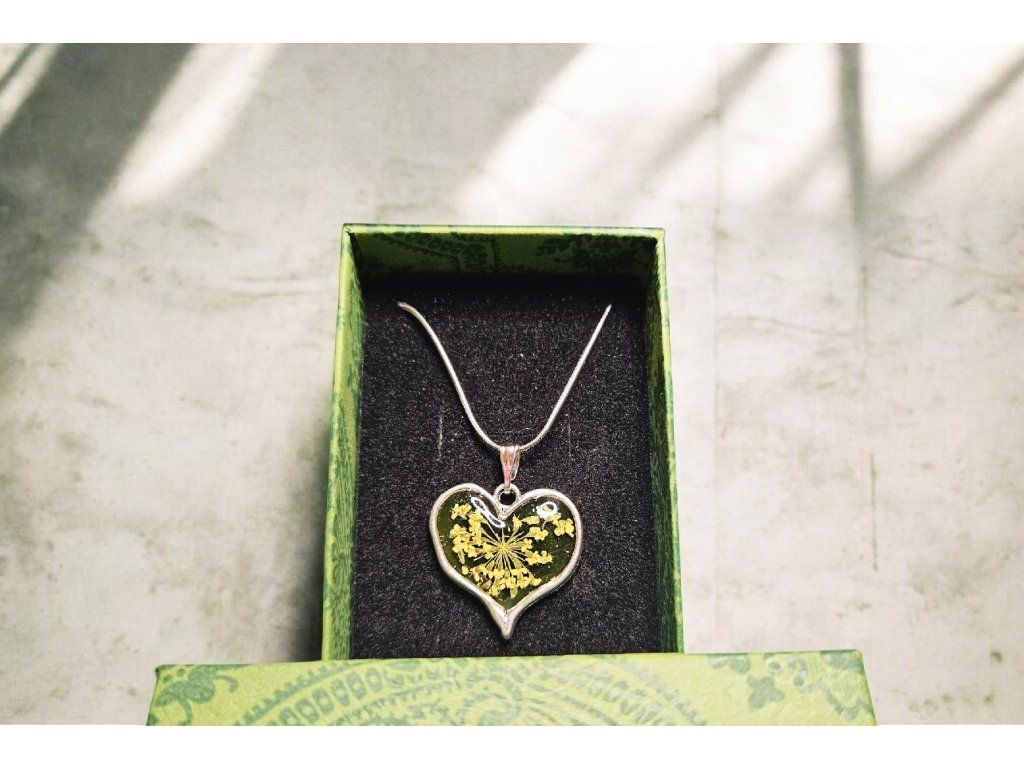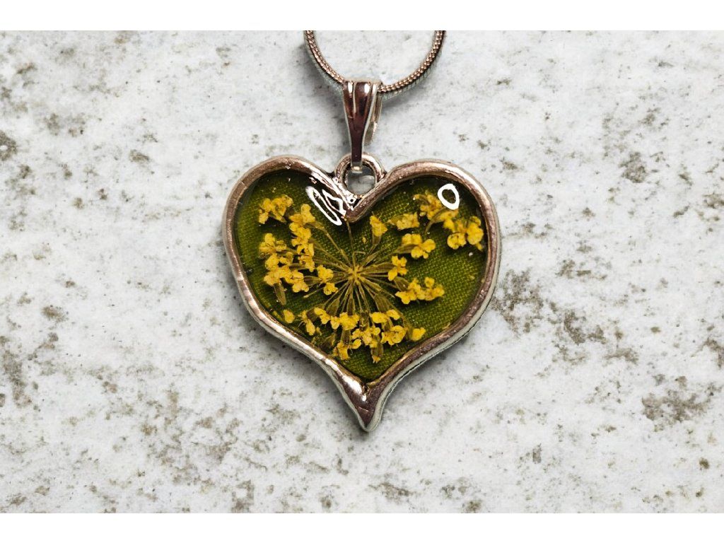 Romantický ručně vyráběný náhrdelník s přívěskem ve tvaru srdce z křišťálové pryskyřice v sytě zeleném odstínu. Uvnitř přívěsku jsou zalité drobné žluté kvítky, které vytvářejí jemný květinový motiv inspirovaný přírodou a sluneční energií. Lesklý povrch pryskyřice krásně odráží světlo a zvýrazňuje detail ruční práce.