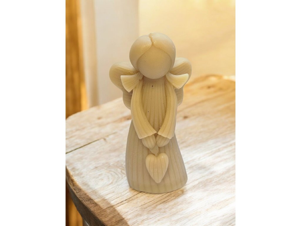 Elegantní anděl z čistého včelího vosku, který působí něžně a uklidňujícím dojmem. Jeho jemné křivky, ručně modelované detaily a srdíčko v dlaních z něj dělají krásnou dekoraci i hluboce symbolický dárek.